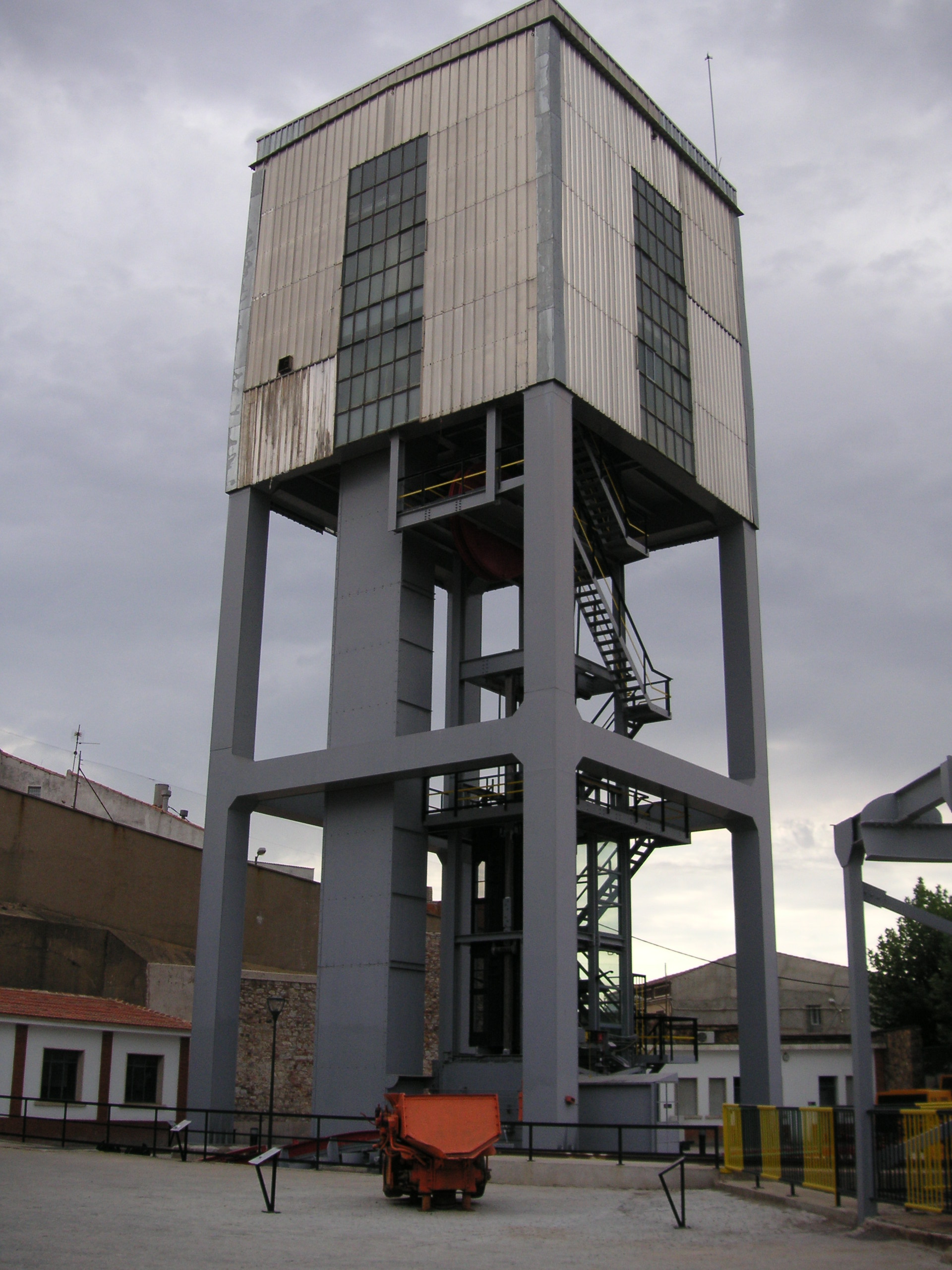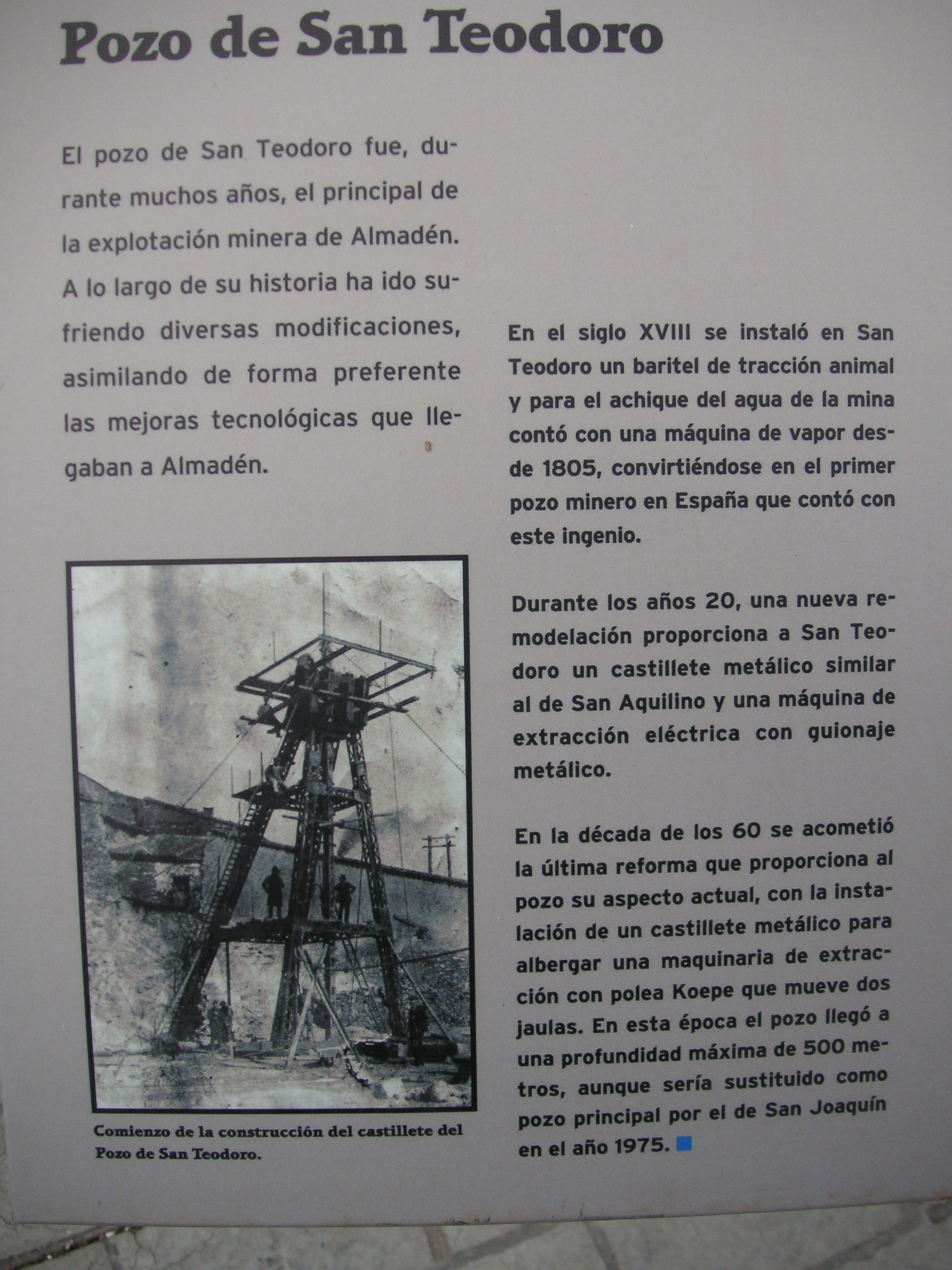 Cartel sobre el Pozo San Teodoro En la entrada a las jaulas que bajan a la mina