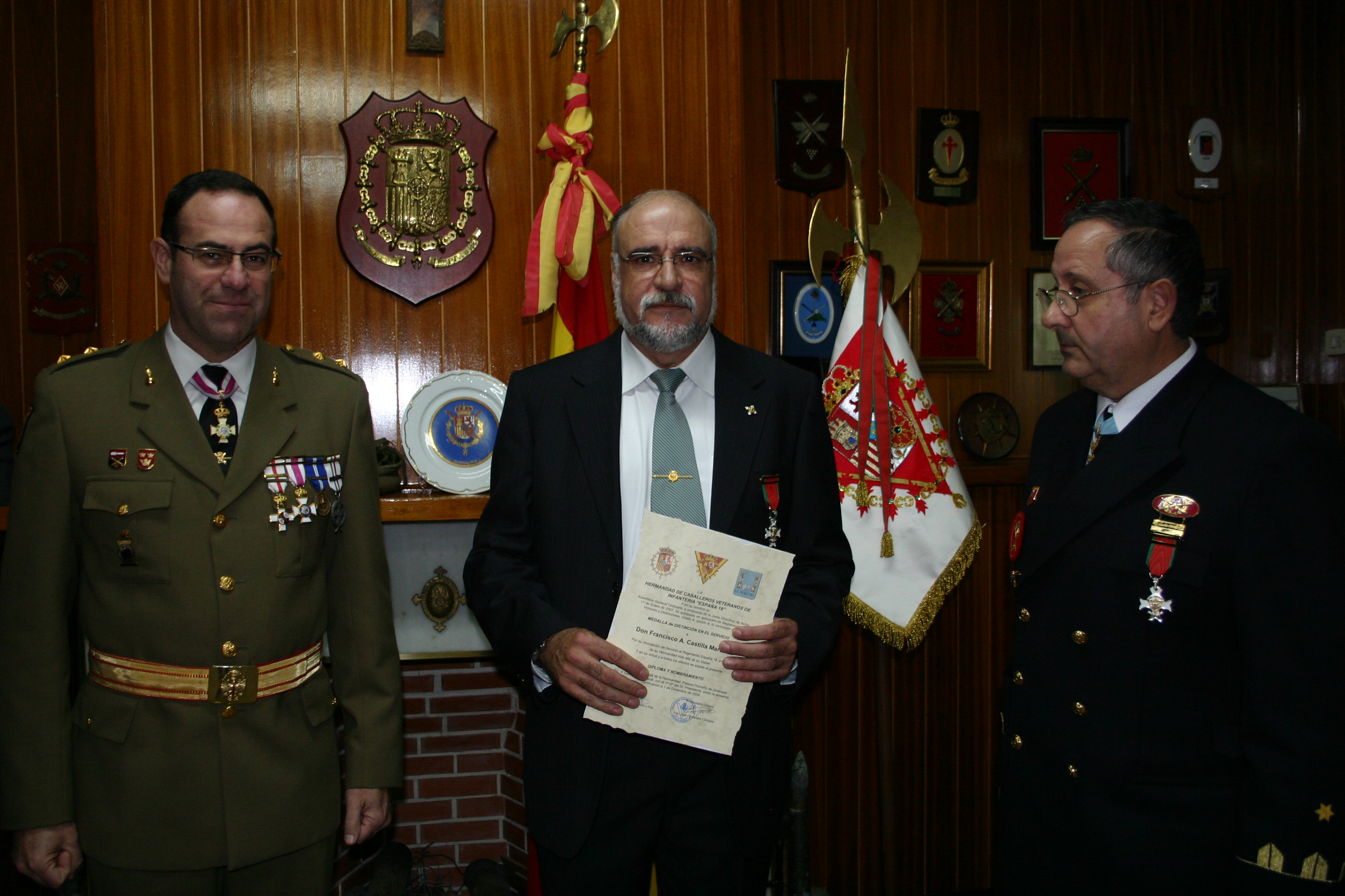 Y para terminar y antes de proceder a la imposición de Las Medallas de la Hermandad, Quiero agradecer a la Junta Directiva, el trabajo constante durante todo el año, por mantener la actividad de la Hermandad, en especial al Vicepresidente, Comandante D. Teodosio de Juana López, por su empuje en la toma de decisiones ante las acciones comprometidas, al Secretario General Comandante D. José Fernández Carrasco, sin cuyo trabajo diario y minucioso, no sería posible terminar ninguna iniciativa, y finalmente al Vocal del Regimiento, Cabo 1º D; Antonio Sánchez Antolinos, por darnos el aliento y trasmitirnos su espíritu de superación, antes las incertidumbres.