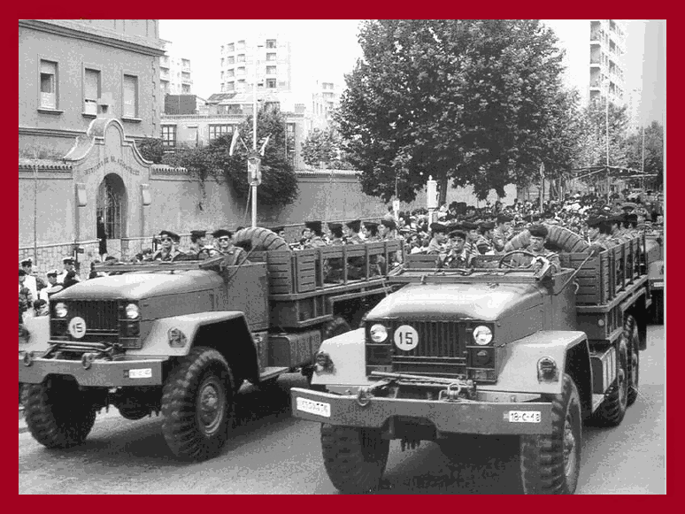 Camiones REO del España 18 desfilando por el Paseo Alfonso XIII de Cartagena.-Año 1968-80