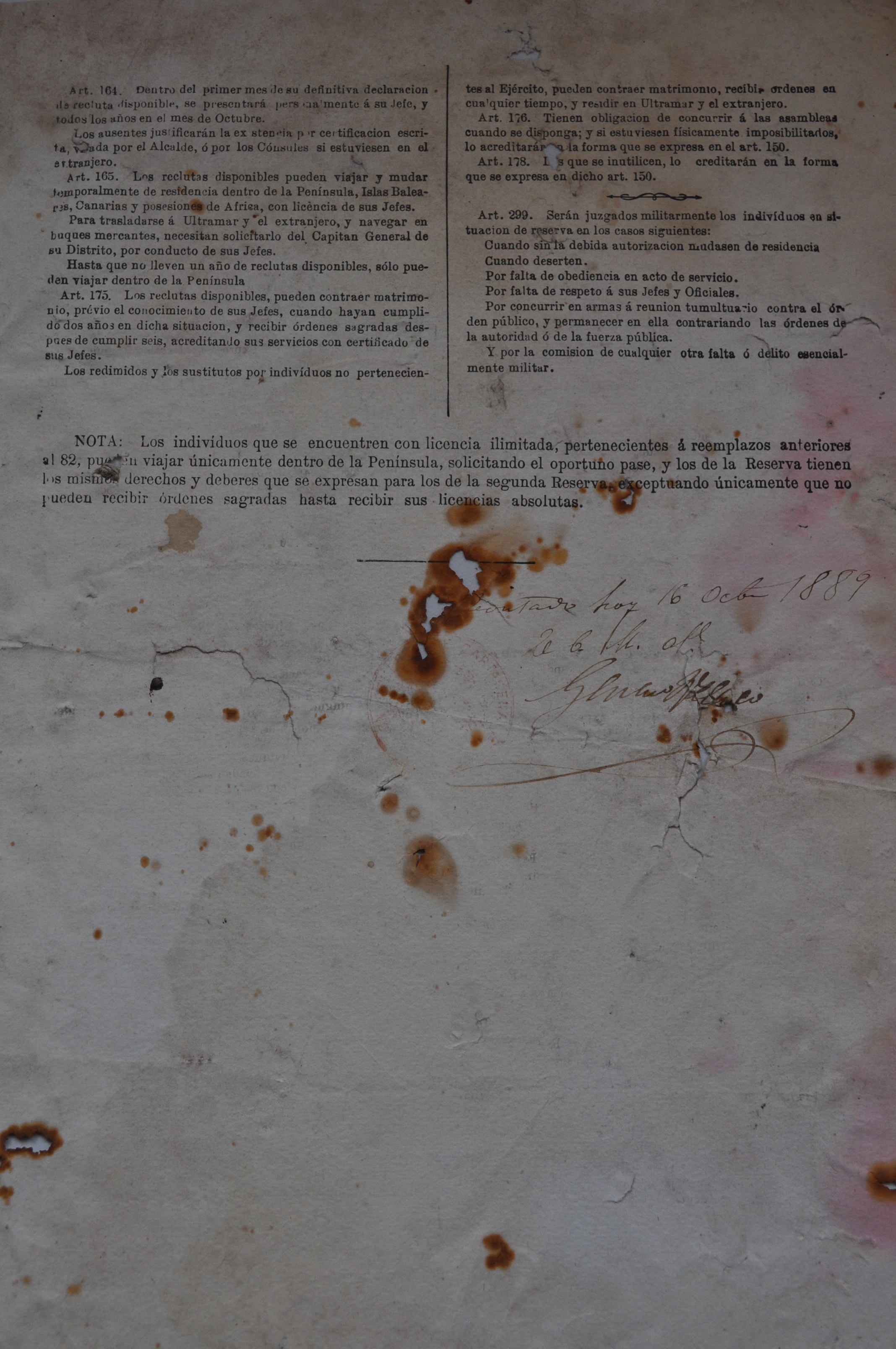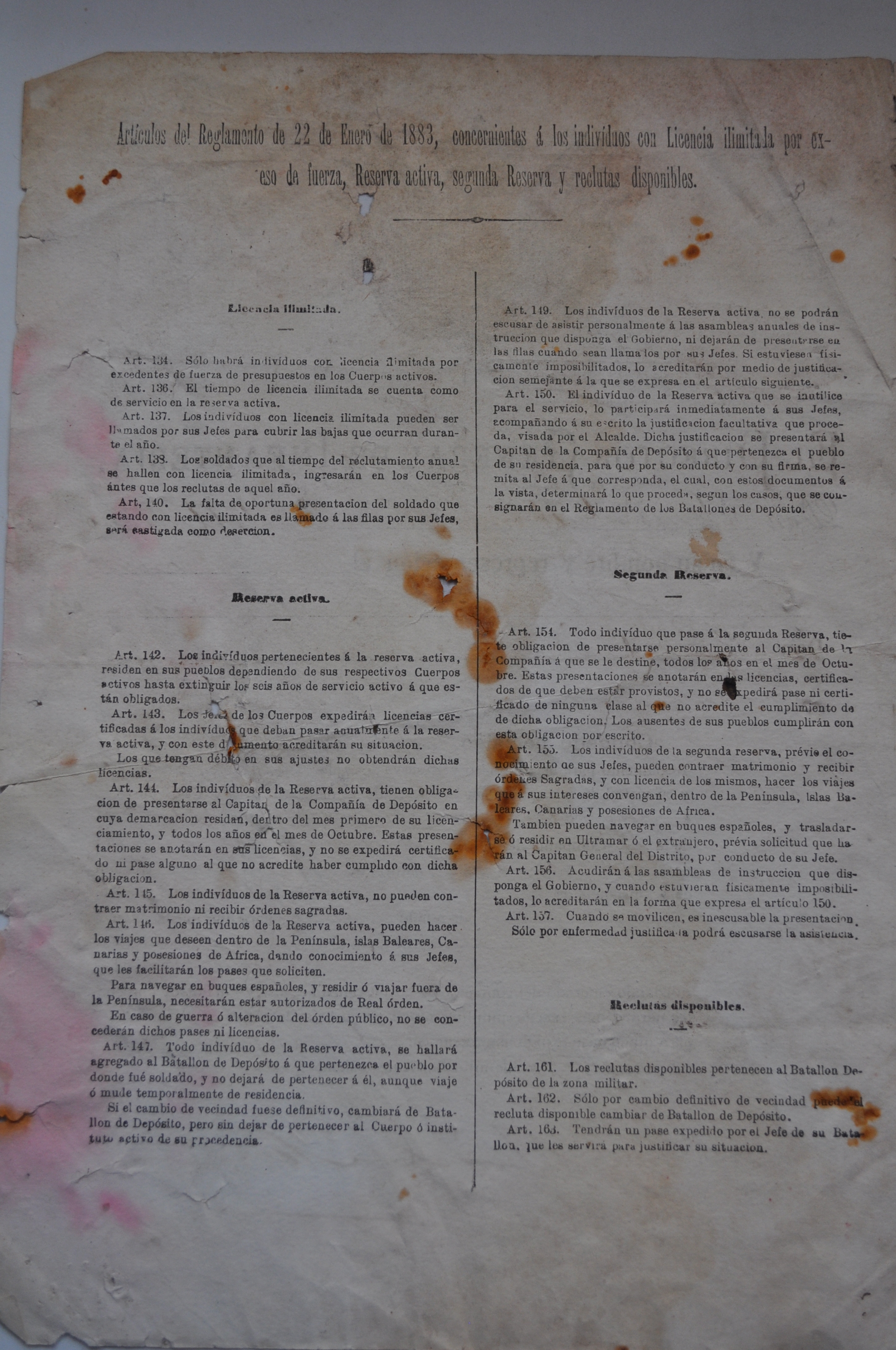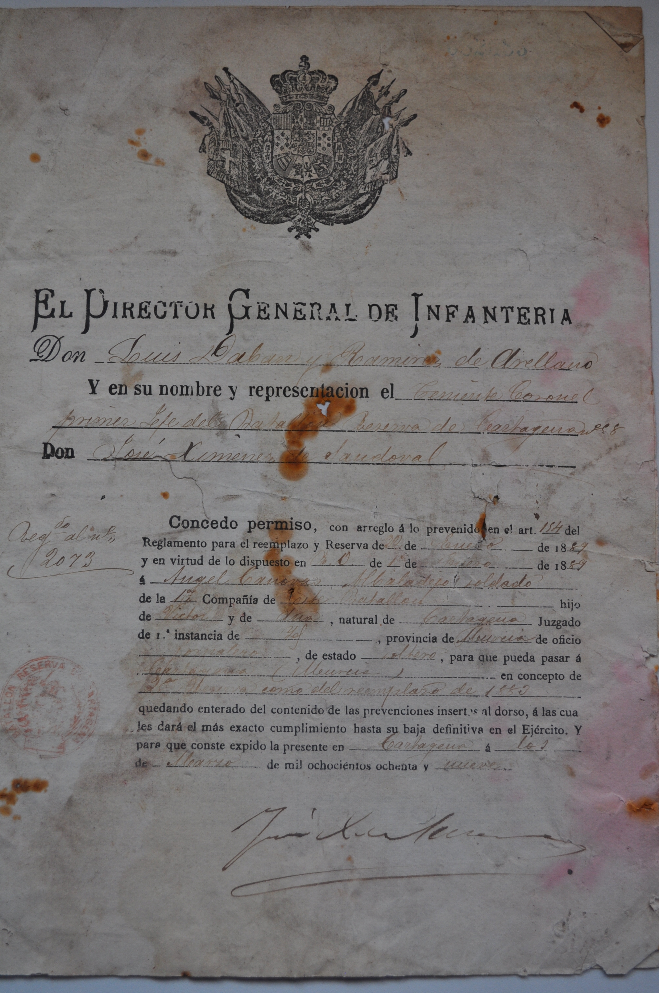 Como se puede observar pertenece a una autorización del año 1889 para marchar de permiso-reserva de un soldado que pertenecía a un Batallón de Reserva que posiblemente estaba de guarnición en el Cuartel de Antigones, a la autorización se acompañaba las normas y reglamento a seguir por los reservistas.