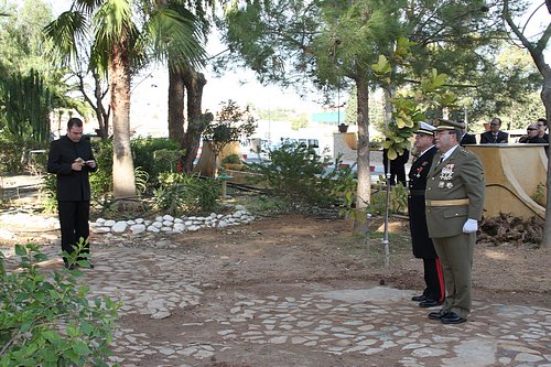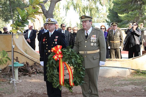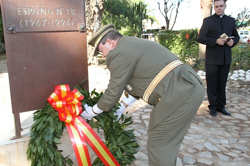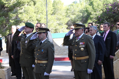 Una vez terminada la misa nos dirigimos a la entrada del Acuartelamiento, donde en los jardines esta instalado el Monolito en Memoria del Regimiento, donde se realizo un acto en memoria de todos los caídos del arma de Infantería. La Corona de Laurel fue portada por el Ilmo. Sr. Coronel D. Ángel Gómez de Salazar y nuestro presidente D. Domingo Pedreño, rezando el pater una oración y sonando por los altavoces el toque de oración. Al final se canto el Himno de Infantería.