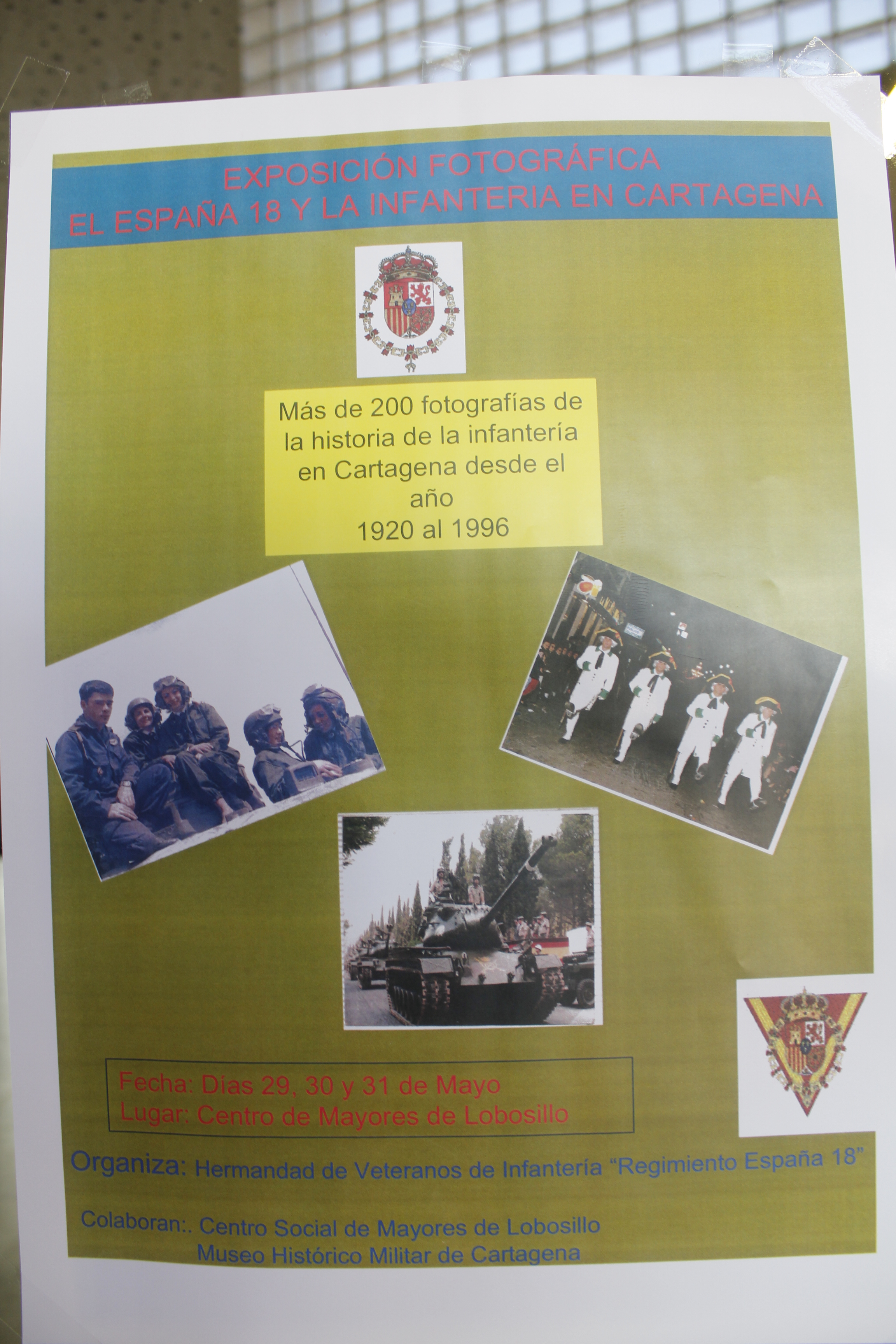 Los días 29, 30 y 31 del mes de Mayo de 2015 esta Hermandad de Veteranos a realizado con la colaboración del Centro Social de Mayores de Lobosillo (Murcia) una exposición Fotográfica titulada "El España 18 y la Infantería en Cartagena", dicha muestra ha estado compuesta por 170 fotografías del fondo de esta Hermandad de Veteranos.