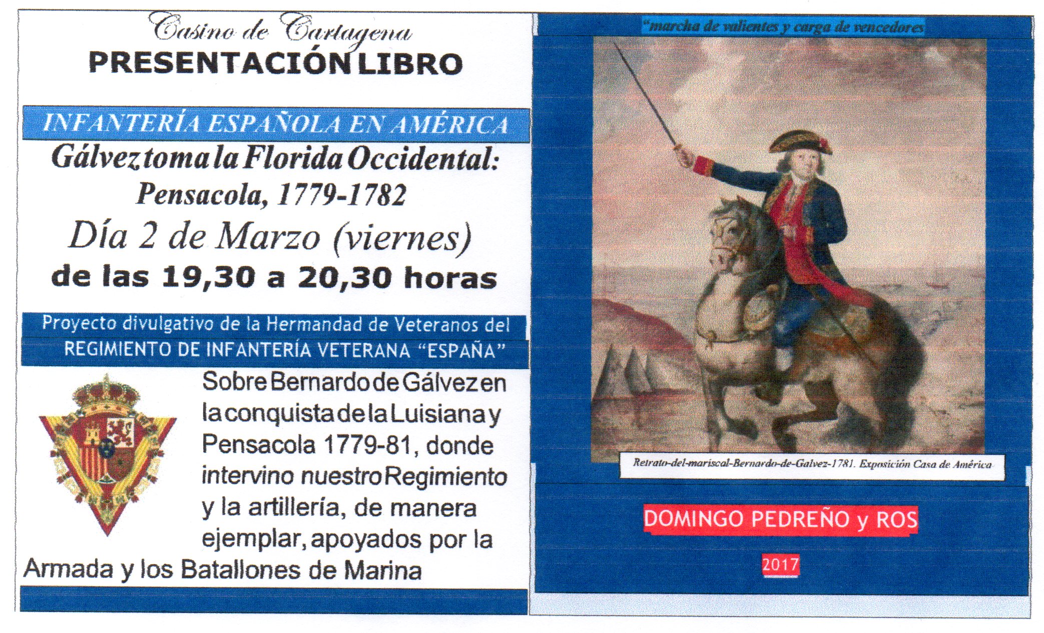 El viernes día 2 de Marzo de 2018 a las 19,30 horas fue presentado en el Casino de Cartagena el libro editado por la Hermandad de Veteranos INFANTERÍA ESPAÑOLA EN AMERICAdel que es autor nuestro presidente Domingo Pedreño y Ros, la presentación del acto y del autor fue el Coronel de Artillería en situación de retirado D. Juan Gómez Vizcaíno, gran colaborador de esta Hermandad de Veteranos, en dicha presentación se contó con la asistencia del Coronel del Regimiento de Artillería Antiaérea nº 73 y Gobernador Militar de la Región de Murcia Ilmo. Sr. D. Enrique Silvela Díaz-Criado, así como concejales del Ayuntamiento de Torre-Pacheco y de Cartagena y de compañeros de la Hermandad y publico en general. El autor hizo una exposición sobre el personaje del General Gálvez, así como su incursión al mando del ejercito español en la guerra de la independencia de los Estados Unidos de America.