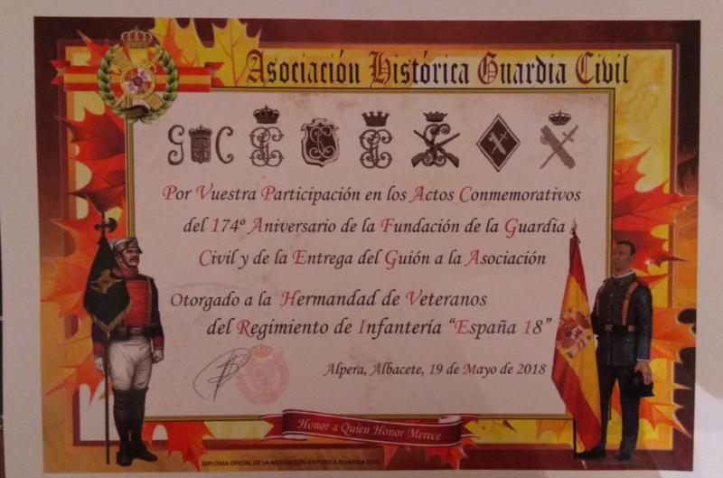 El sábado día 19 de Mayo invitados por la Asociación Histórica de la Guardia Civil, una comisión de esta Hermandad de Veteranos ha asistido a los diferentes actos celebrados en la localidad de Alpera (Albacete) con motivo del 174ª Aniversario de la creación de la Guardia Civil y la entrega del Guión a dicha Asociación.